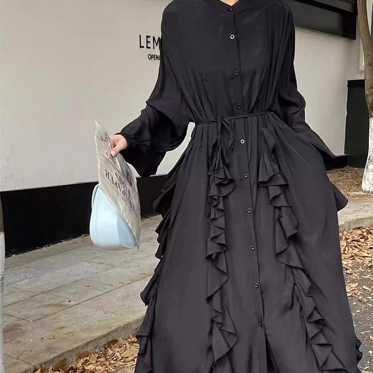 Шикарные платья Весеннее французское элегантное платье с нерегулярными оборками Длинные рукава Длинная юбка Женские платья One Size чёрный