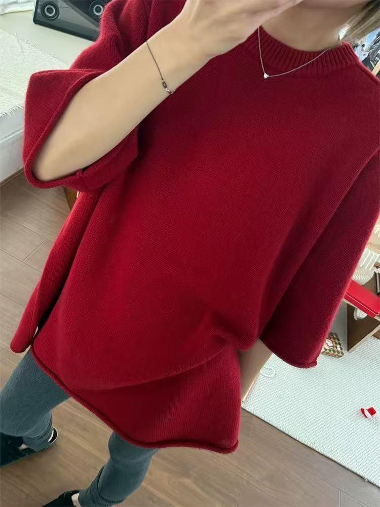 Шикарный женский свитер с рукавом пять четвертей с подвернутым краем - Вязаный свободный для весны/лета Large