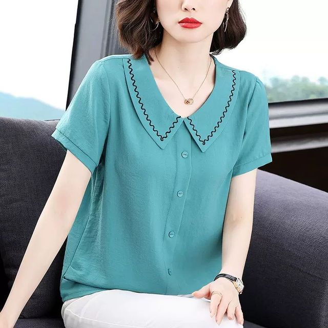 Шифоновая рубашка с короткими рукавами и кукольным вырезом для женской блузки, новый летний свободный модный топ для мамы с вышивкой M небесно-голубой