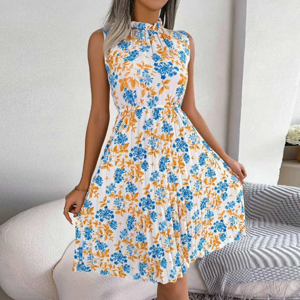 Шифоновое платье с оборками и воротником-стойкой, летнее платье с плиссированным подолом, женское платье с высокой талией и цветочным принтом