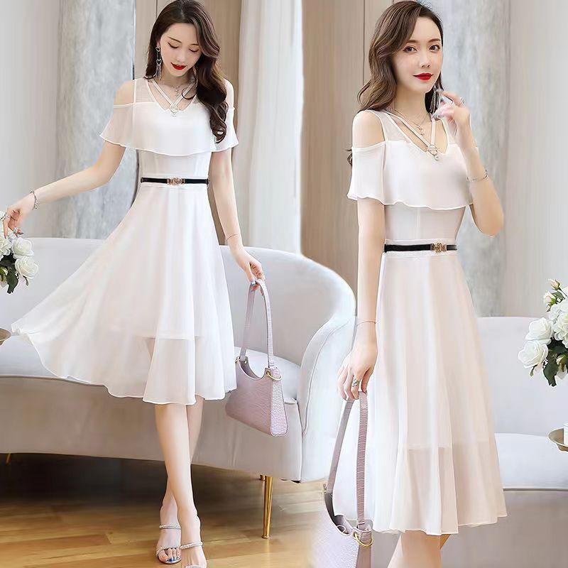 Шифоновое платье с открытыми плечами и поясом, женское летнее корейское платье с тонкой талией средней длины и тонкой темпераментной юбкой феи без бретелек M белый