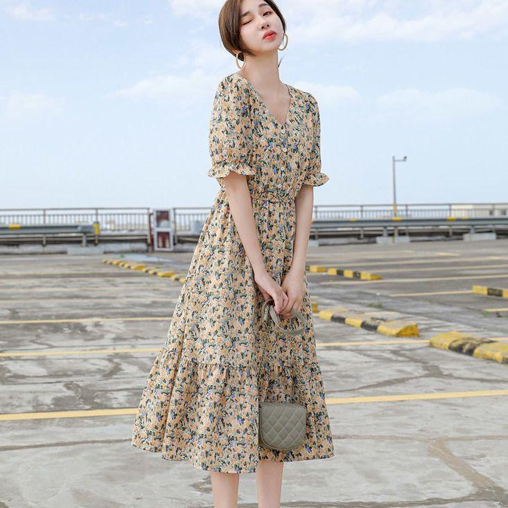 Шифоновое платье с v-образным вырезом и французским цветочным принтом, летняя корейская версия, женское элегантное свободное платье большого размера со скрытой талией 2XL