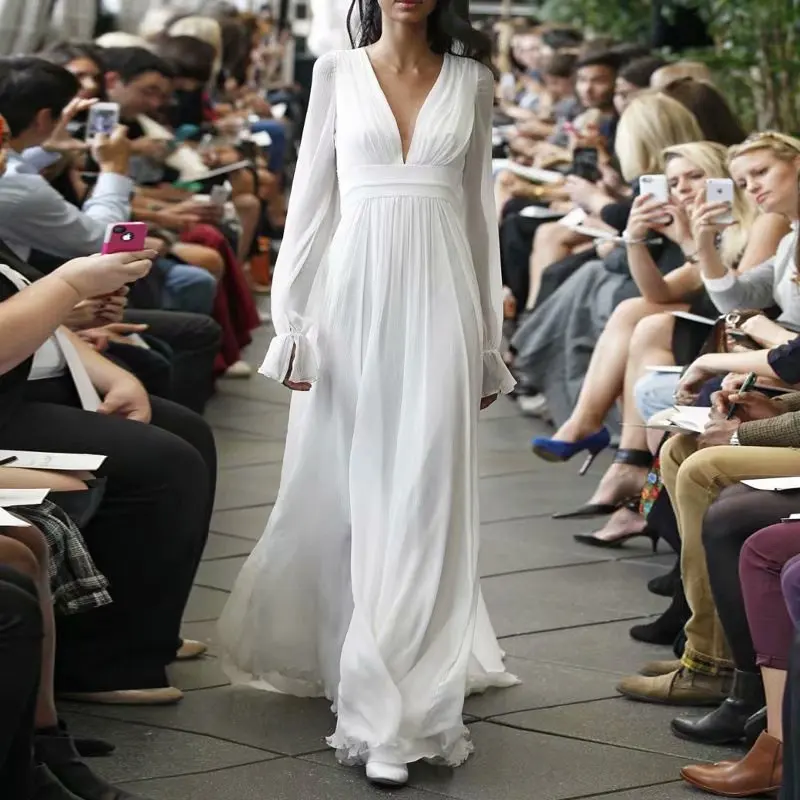 Шифоновое свадебное платье, с V-образным вырезом, с длинными рукавами