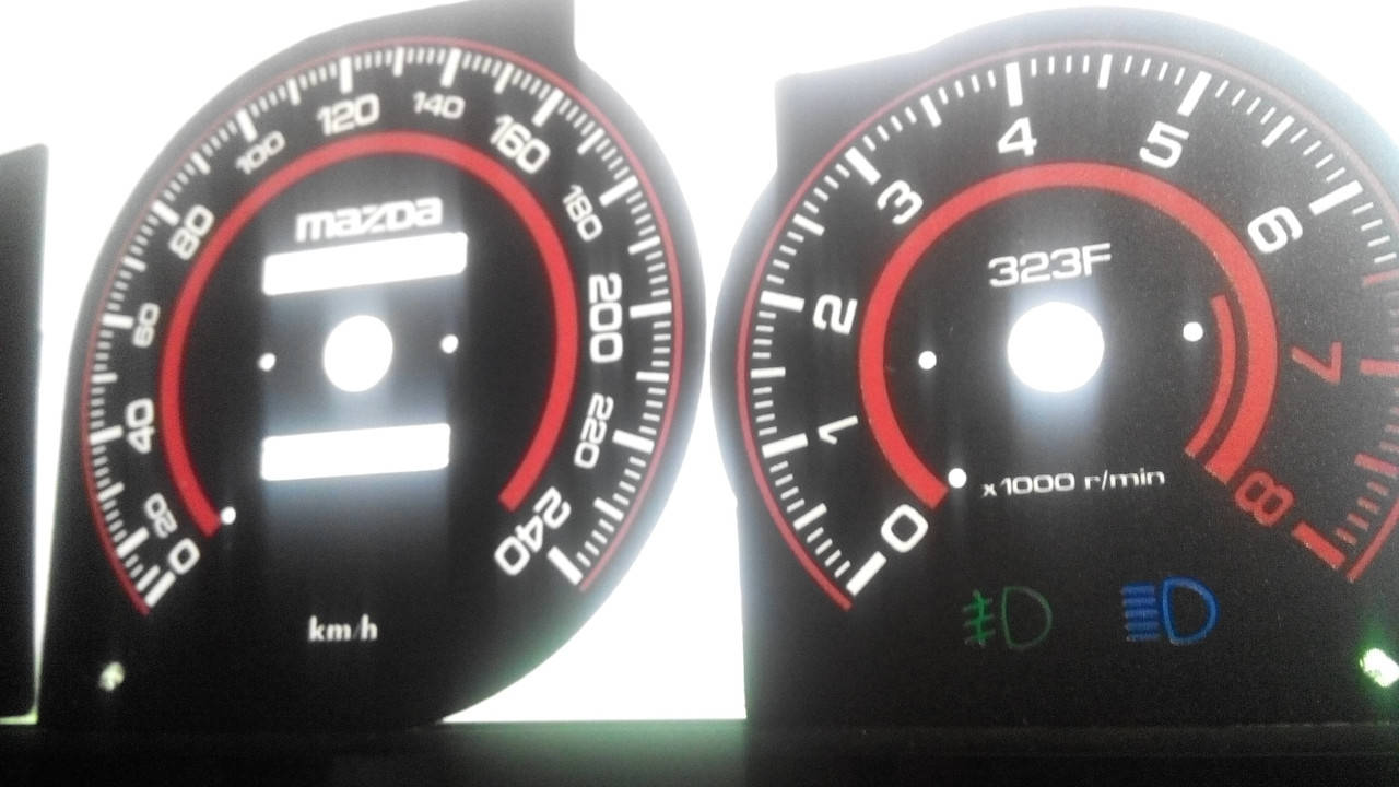 Шкалы приборов Mazda 323 f ba с прозрачными делениями и цифрами (возможно изготовление дизайна по вашему вкусу до полного согласования), ставятся вместо штатных. Цвет подсветки зависит только от ваших светодиодов. Материал термостойкий пластик 0,8мм (не пленка) + тройная заливка матового черного + компьютерная порезка. Возможна отправка в любой регион Украины.