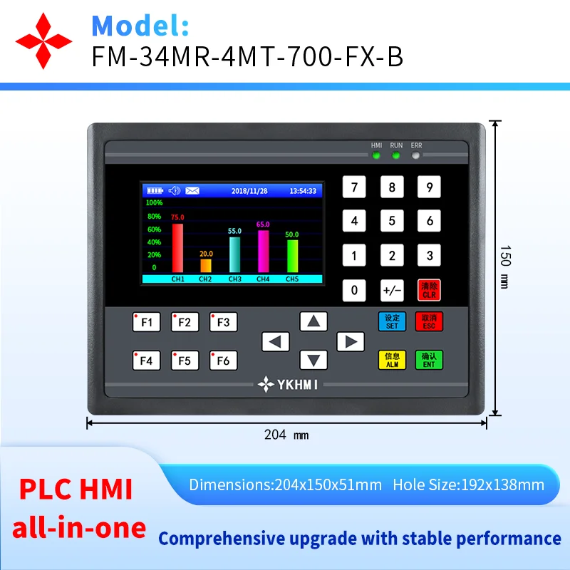 YKHMI 7'' Text Display Built In PLC Integrated logic controller with 4AD 4DA 5Temperature, 16In 14Out, 2 Hight Speed Pulse 100K