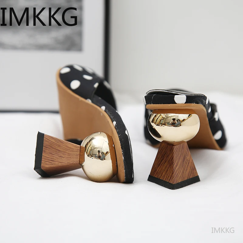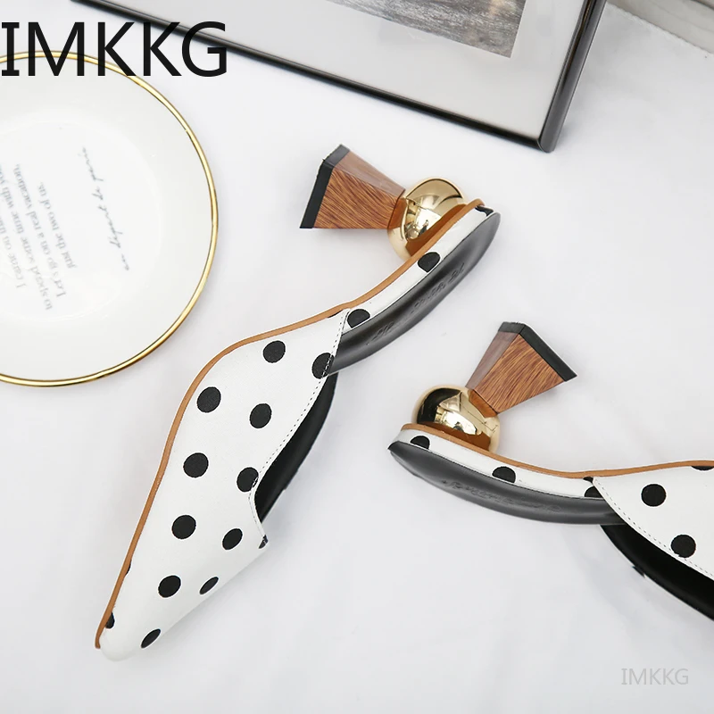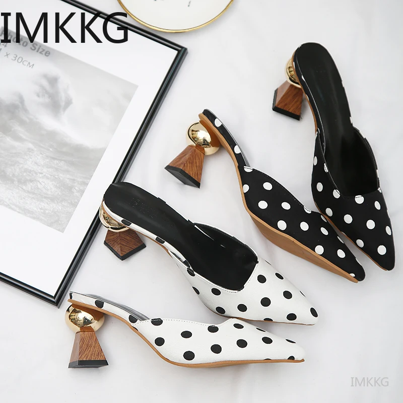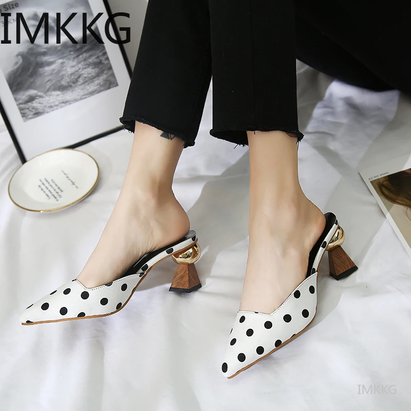 Шлепанцы женские в горошек, заостренный носок, мюли, сланцы, высокий каблук, закрытый носок, сандалии