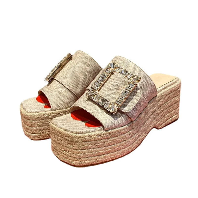 Шлепанцы женские из пеньковой веревки, классические модные туфли на танкетке, роскошные сандалии с квадратными пуговицами, украшение для л...