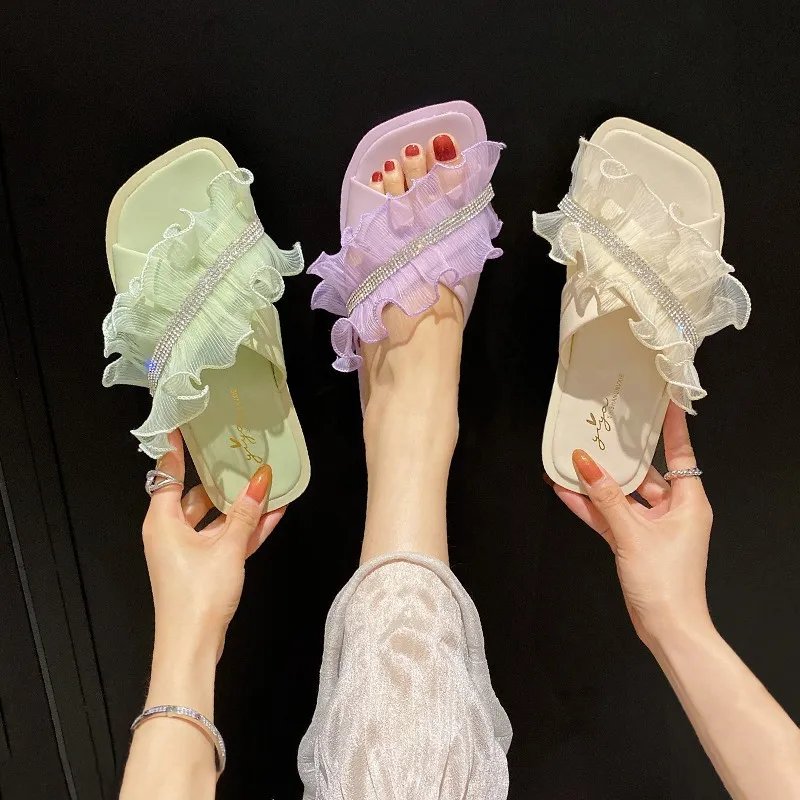 Шлепанцы женские кружевные, ярких цветов, на квадратном каблуке 1-3 см