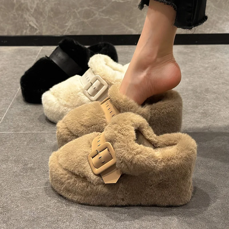 Шлепанцы женские меховые, Сланцы на танкетке, Роскошные, с закрытым носком, из флока, плюшевые дизайнерские туфли в римском стиле, 2023