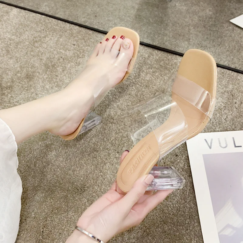 Шлепанцы женские на квадратном каблуке, прозрачные туфли-лодочки, квадратный каблук, без задника, высокие туфли-лодочки, Искусственная рези...