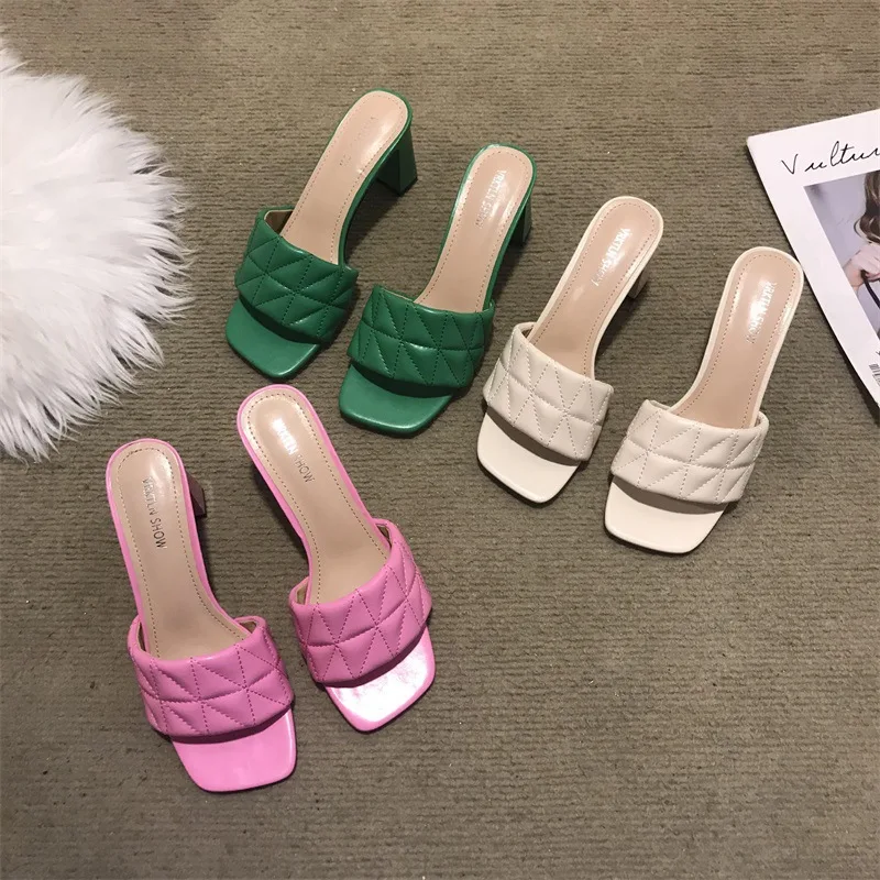 Шлепанцы женские на квадратном каблуке, резиновые сандалии, квадратный каблук, сланцы, высокий квадратный каблук, гавайская ткань, ПУ, римские базовые, Нескользящие, 2023