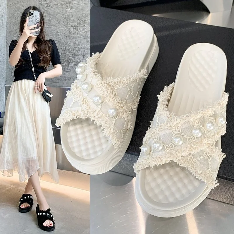 Шлепанцы женские на танкетке, Нескользящие, на шнуровке, с жемчугом, перекрестные ремешки, пляжная обувь, 2022
