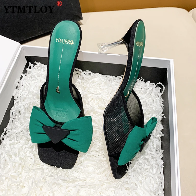 Шлепанцы женские на тонком каблуке, с бантом, сетчатые сандалии с прозрачным каблуком, женские сланцы, уличная элегантная зеленая обувь веч...