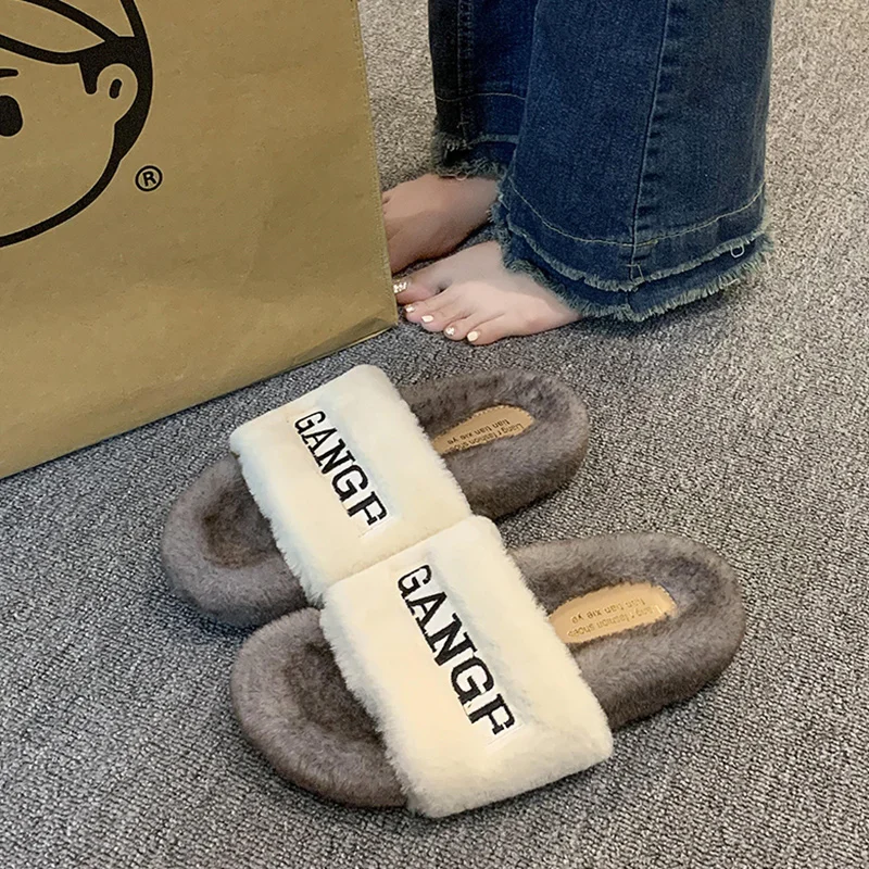 Шлепанцы женские резиновые, искусственная кожа, плюшевые тапки, сланцы, римские, средний каблук, плоская подошва, 2023