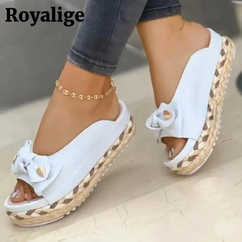 Шлепанцы женские с бантом, повседневные сандалии на платформе, плетеные, однотонные, сланцы, пляжная обувь, лето 2023