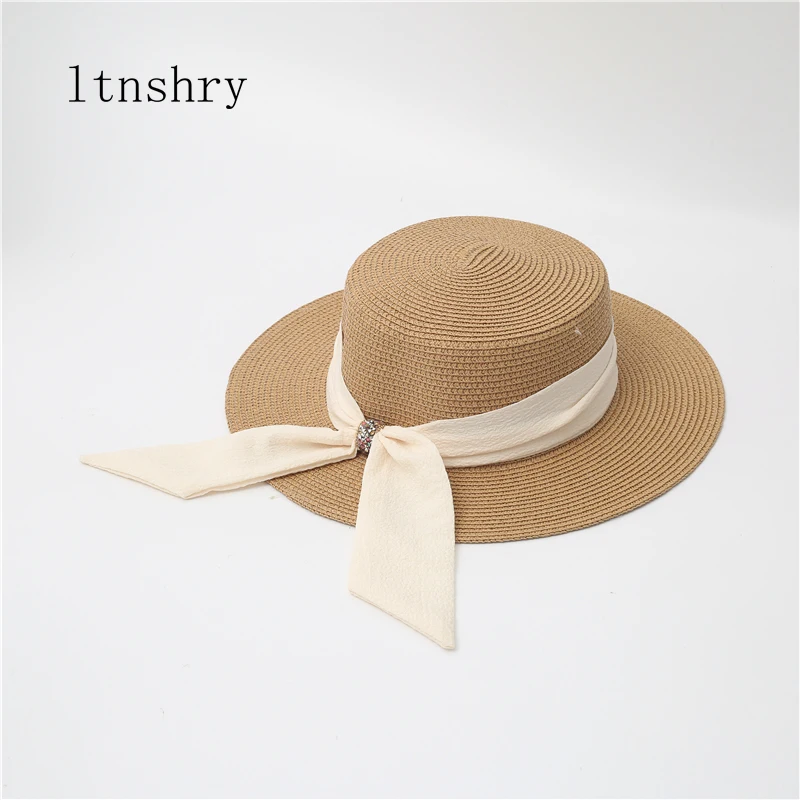 Шляпа женская Соломенная с бантом, Панама от солнца с плоским верхом и лентой, Пляжная большая, для защиты от солнца, лето 2022