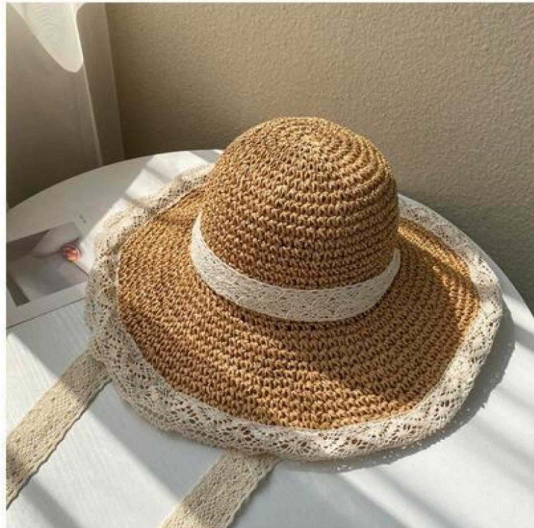 Шляпа женская прилив летняя дорожная кружевная ручная работа кружевная полая маленькая свежая ветрозащитная веревка крючком соломенная шляпа M(56-58cm) хаки