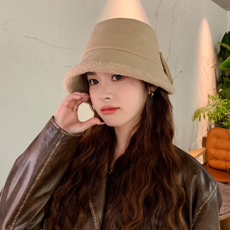 Шляпа женская японская шляпа-ведро из искусственной овечьей шерсти с бантом, утолщенная плюшевая теплая повседневная универсальная шляпа-тазик Tide One Size