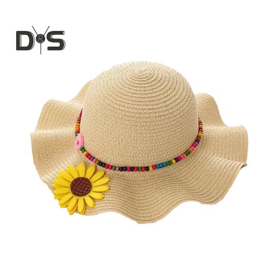 Шляпа от солнца для мальчиков и девочек, солнцезащитный дизайн, дышащая пляжная шляпа, волнистые поля, желтые цветы, бусины, плетеная соломенная шляпа бежевый