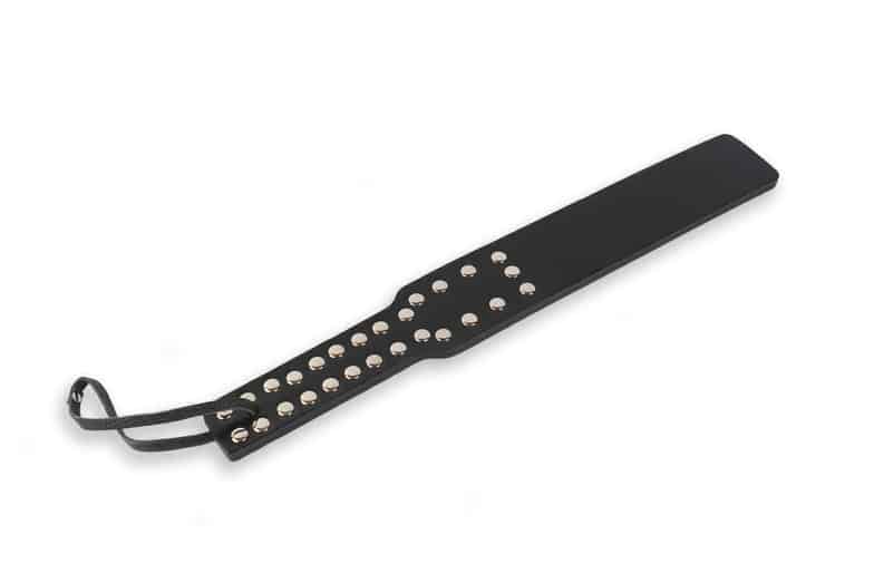 Шлёпалка - классический ударный девайс, применяемый в БДСМ и не только. Атрибут изготовлен из кожи черного цвета. Ручка и нижняя часть шлёпалки украшены хромированными заклёпками.