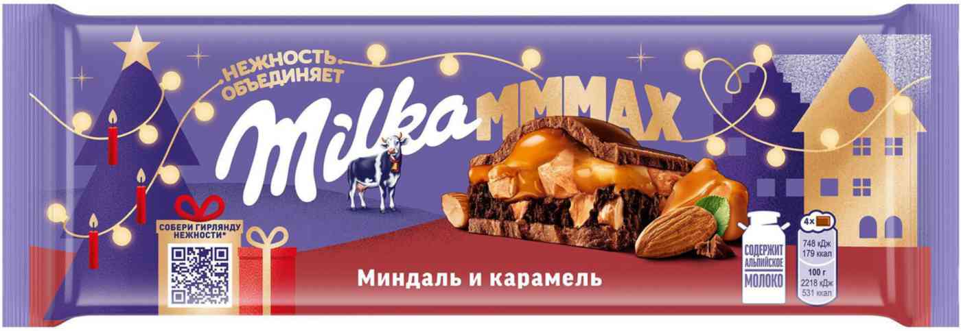 Шоколад молочный Milka MMMAX с миндальной начинкой с какао, 270 г — это сочетание хрустящего дробленого миндаля, мягкой карамельной начинки и тающего молочного шоколада с альпийским молоком. Разные текстуры, яркие вкусы и неповторимая нежность в мега-формате: эта большая шоколадка Milka создана для бесконечного удовольствия!Большая шоколадка Milka MMMAX — это не просто сладость к чаю. Это отличная возможность выразить свои чувства сделать приятное близким. Преподнесите шоколадку в подарок второй половинке или родным, чтобы поделиться искренним теплом и наполнить их день моментами нежности!Шоколад молочный с миндальной начинкой с какао в большой упаковке идеально подойдет к чаю и принесет в будничную жизнь праздничную атмосферу. Смотрите любимые фильмы, приглашайте друзей или наслаждайтесь любимым вкусом наедине с собой.