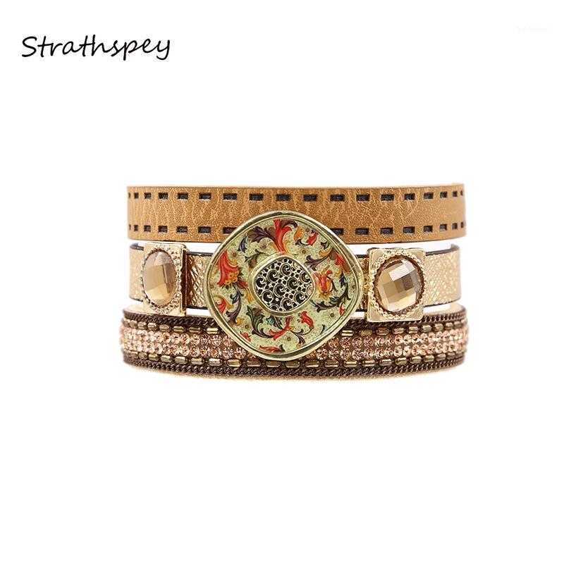 Bracelet PU Leather For Women Pulseira Bomemia Flora Enamel Metal Decorated Rhinestone Set Multi Rows Bracelets Black & Brown1
