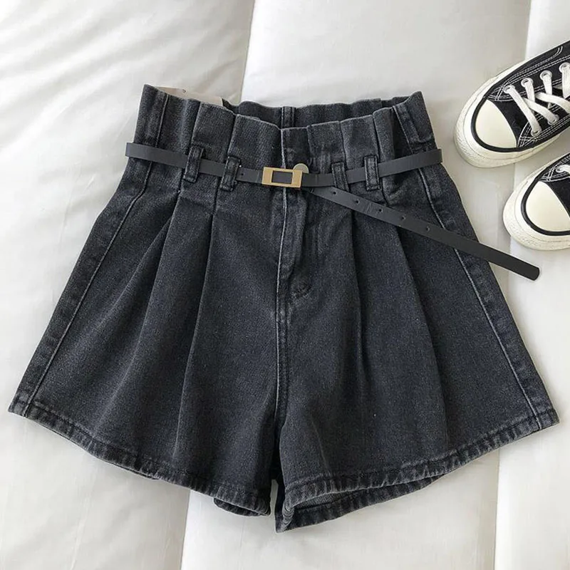 Шорты женские джинсовые с завышенной талией, повседневные винтажные Широкие штаны с поясом, модные короткие трапециевидные брюки на пуговицах, с застежкой-молнией, однотонные