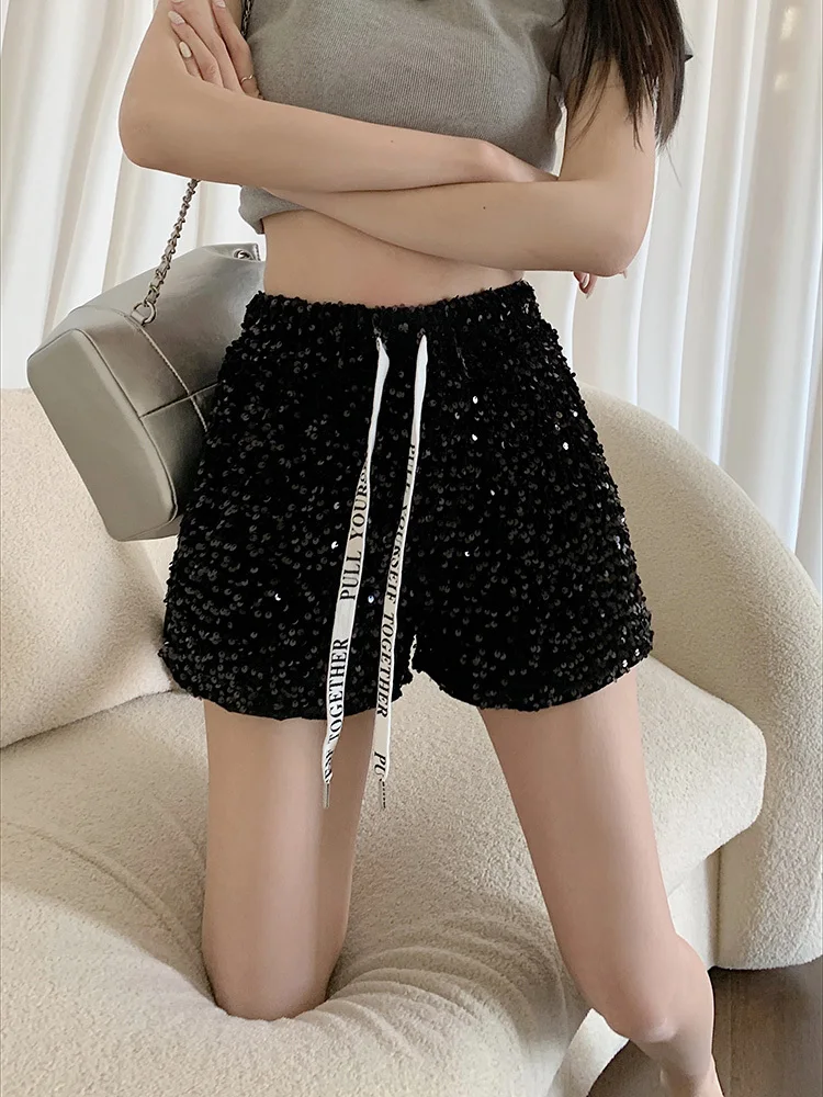 Шорты женские со шнуровкой и надписью, соблазнительные короткие брюки с блестками и эластичным поясом