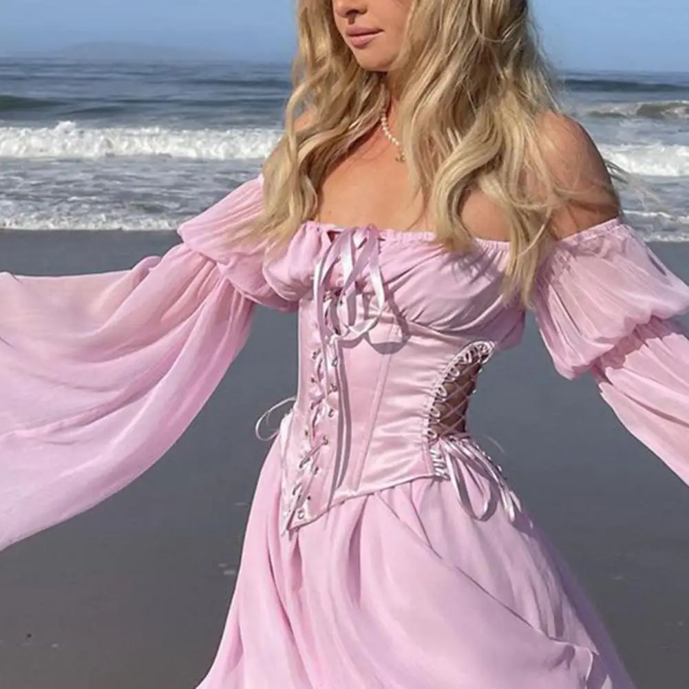 Sexy Women Dress Tight Waist Sleeve Ruffle Lace-Up Gathered Waist Cincher Dress for Beach