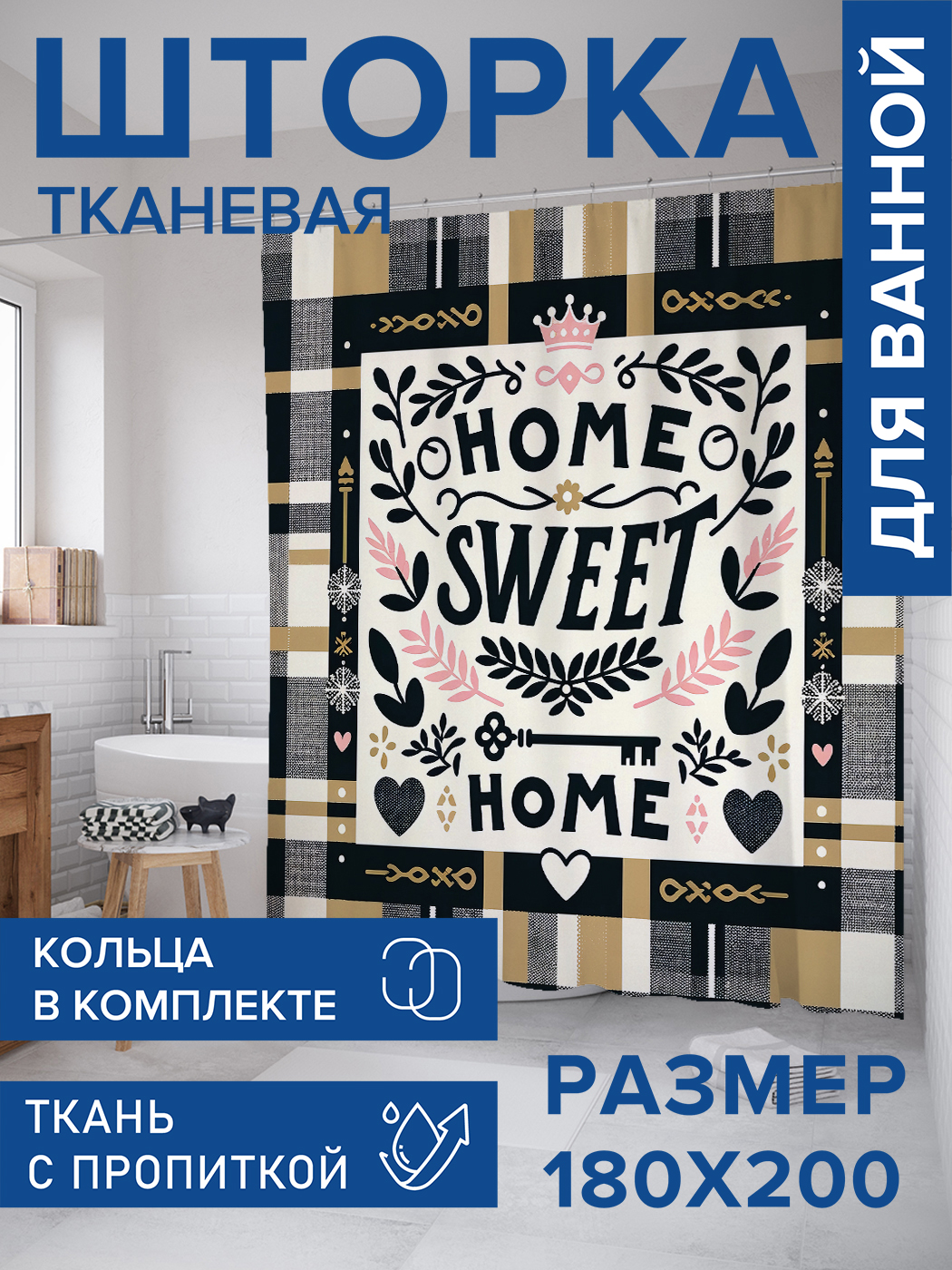 Штора для ванной тканевая JoyArty "Дома хорошо", 180х200, sc_sd1627, Коричневый
