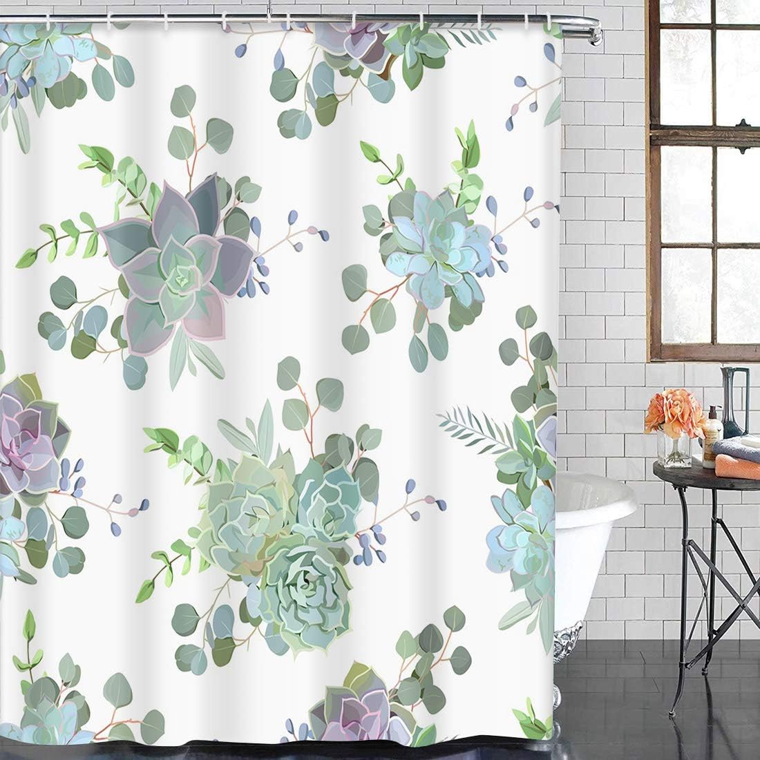 Шторка для душа Цветок Зеленый Красочный Суккулент Эхеверия Натуральный Кактус в Современной Водонепроницаемой Полиэстеровой Ткани Набор с Крючками 90X180cm