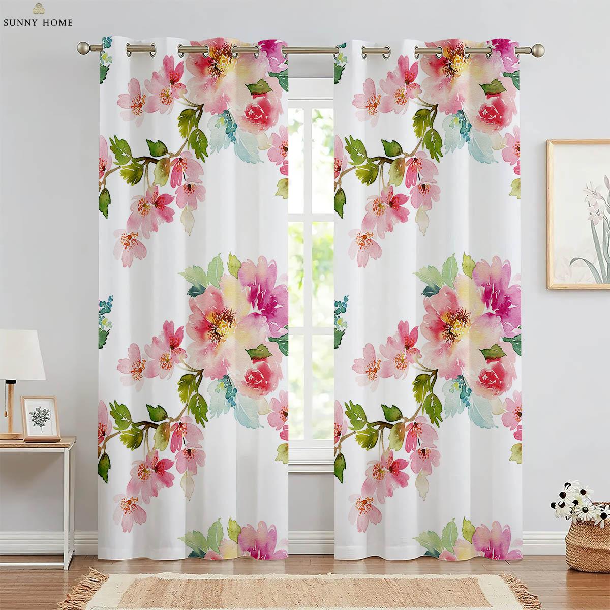 Шторы с акварельным цветочным принтом в пасторальном стиле из полиэфирного волокна, пригодные для машинной стирки, для спальни, гостиной, декоративные шторы, 2 шт. W50xH140(CM)x2PCS&Rod pocket