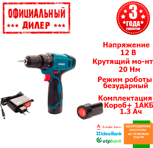 Шуруповерт аккумуляторный Зенит ЗША-1213 А Li-1К (12 В, 1.3 А/ч)