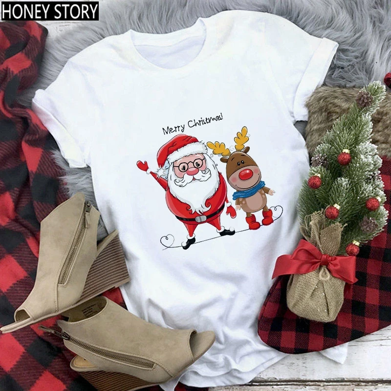 FIXSYS Cute Santa Claus and Reindeer Print Women T-Shirt Unisex Loose Size Casual New Fashion Tops Ladies Christmas Tee Shirt
