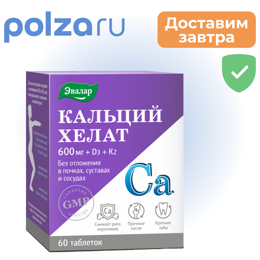 Кальций - это строительный материал костной системы человека. Минерал незаменим для сердечно-сосудистой системы. Также макроэлемент принимает участие в процессах сокращаемости мышц и в возбудимости нервных тканей.Хелат – это самая легкодоступная форма минералов, представляет собой соединение минерала и аминокислоты (органики и неорганики).Кальций хелат способствует:- быстрому восполнению дефицита кальция в организме;- поддержанию нормального состояния костной ткани, зубов;- улучшению функционального состояния сосудов и сердца.Содержание в 2-3 таблетках (суточном приеме) и % от рекомендуемого уровня суточного потребления:2 таблетки - 290 мг - 29% 3 таблетки - 435 мг - 43,5% Рекомендован взрослым и детям старше 14 лет. Также его могут принимать беременные и кормящие женщины.