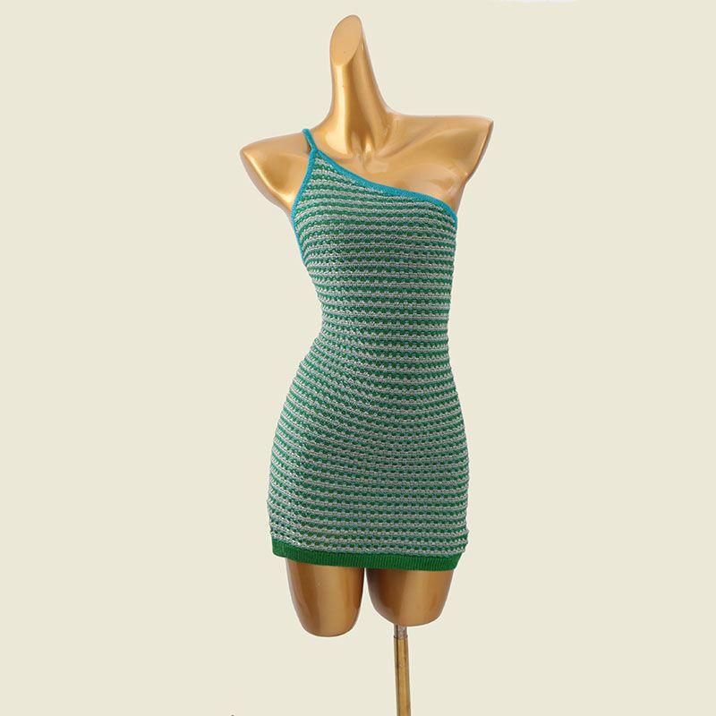 Экспорт Внешняя Торговля Летнее Платье на Одно Плечо с Юбкой по Бедрам Серебристое Цветовое Сочетание Ажурное Сексуальное Платье-Сарафан Вязаное Женское White Interior M