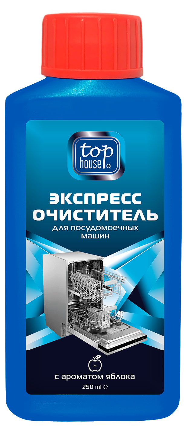 TOP HOUSE Экспресс-очиститель для посудомоечных машин (яблоко), 250мл. Полностью удаляет жировые загрязнения и накипь, очищает форсунки разбрызгивателей и сливные шланги, избавляет от неприятных запахов.