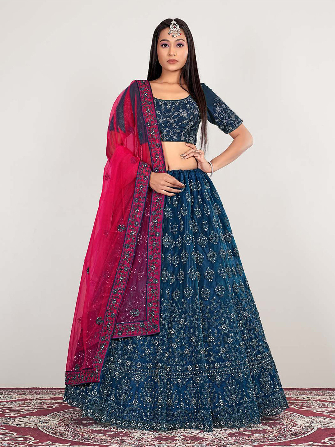 HALFSAREE STUDIO Embroidered Semi-Stitched Lehenga & Unstitched Blouse With Dupatta, Teal