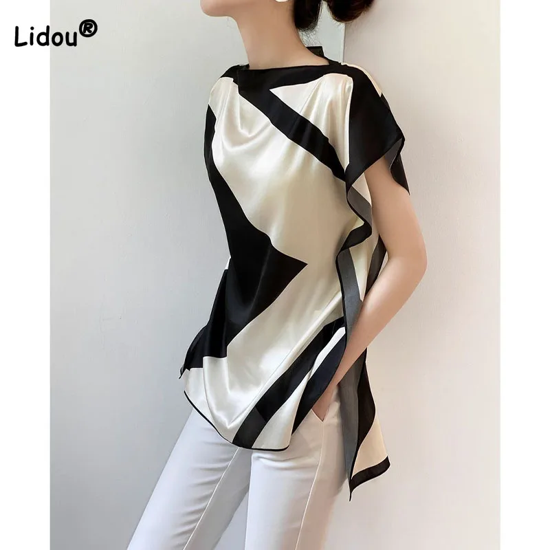 Элегантная модная женская футболка с геометрическим рисунком, новинка на лето, универсальная Корейская рубашка контрастных цветов с воротником-лодочкой, женская одежда