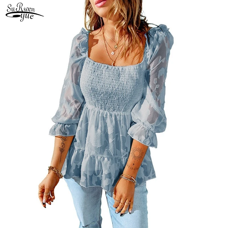 Элегантная шифоновая рубашка с рукавом три четверти, летняя однотонная милая блузка, топы с оборками и квадратным воротником, женская одежд...