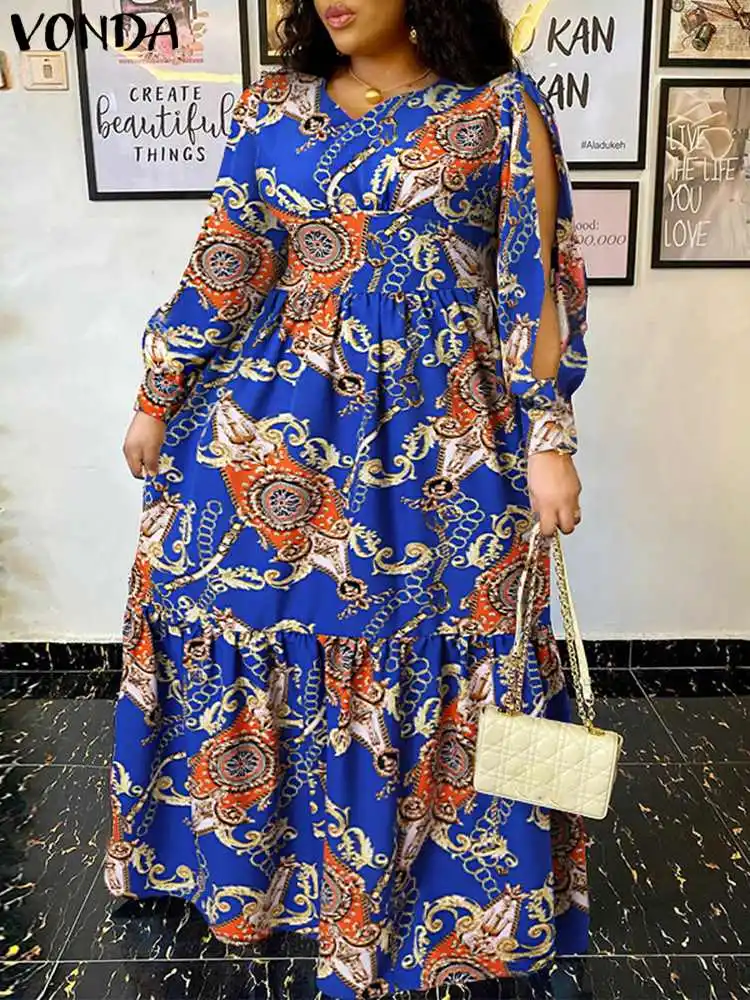 Элегантное богемное осеннее платье VONDA с разрезом, сексуальное праздничное платье с V-образным вырезом, длинный сарафан с длинным рукавом, ж...