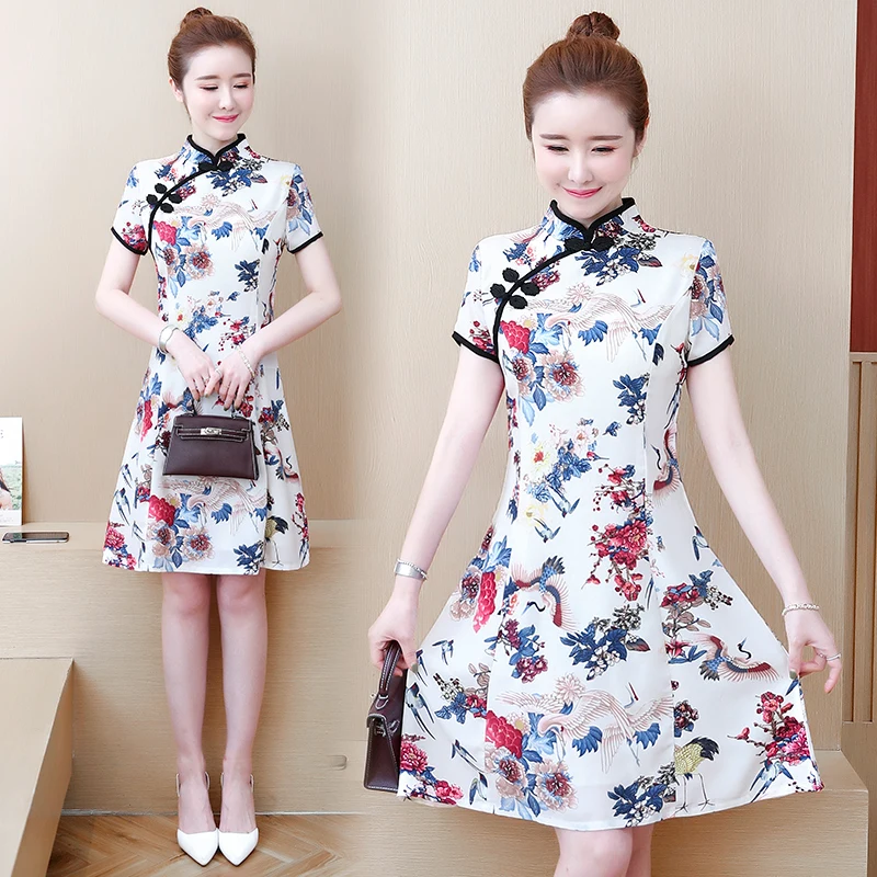 Элегантное винтажное платье-Ципао с цветочным рисунком для женщин и девушек, приталенное повседневное летнее китайское платье для вечерин...