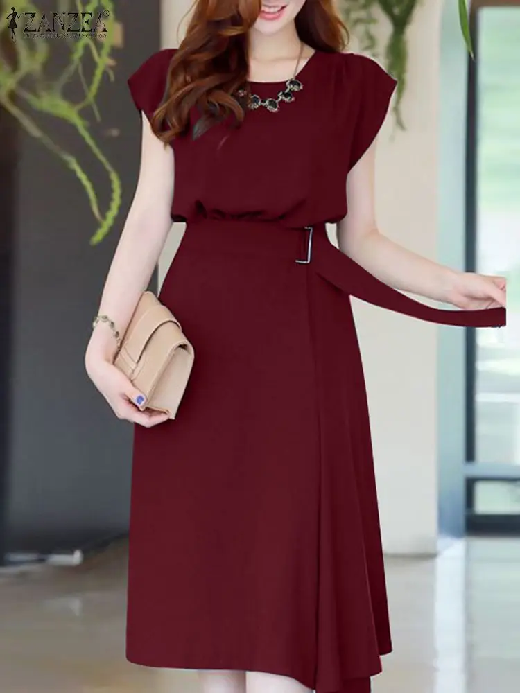 Элегантное женское офисное платье-миди ZANZEA, летний Повседневный Сарафан с круглым вырезом и коротким рукавом и поясом, женское платье, кафтан, Халат