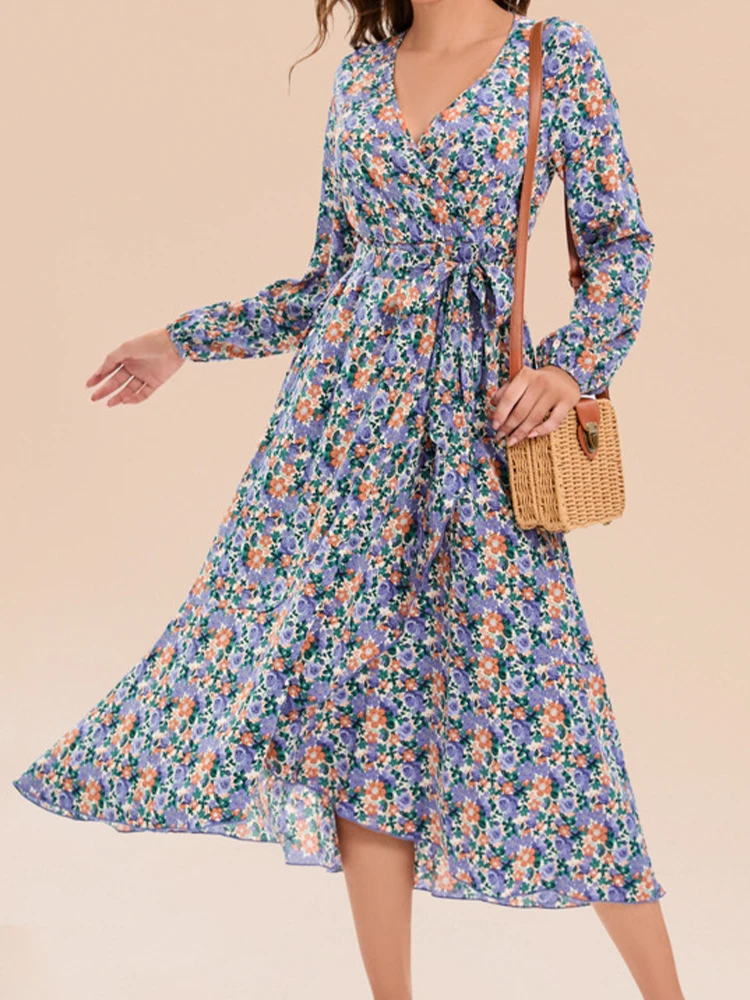 Элегантное платье с цветочным принтом, женское осеннее платье миди с длинным рукавом и v-образным вырезом, женское винтажное повседневное Бандажное пляжное праздничное платье в стиле бохо