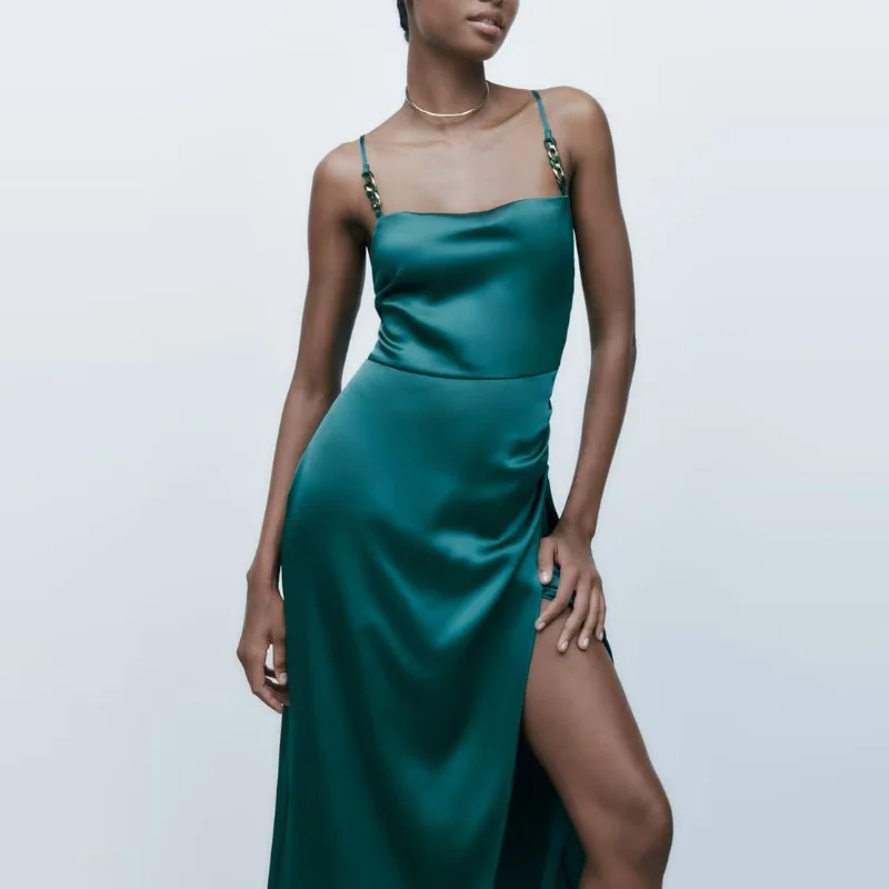 Элегантное и приблизительное платье на бретелях с цепочкой и открытой спиной, атласное платье средней длины с разрезом, женское платье, нов...