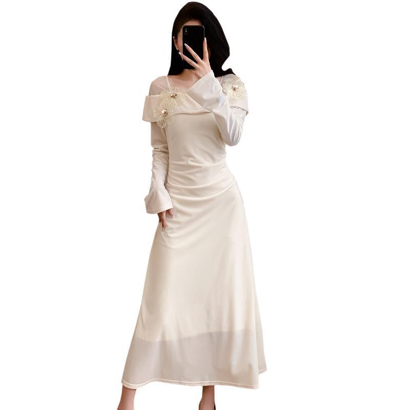 Элегантное французское миди-платье с открытыми плечами, приталенное, Осень/Зима 2025 Large слоновая кость