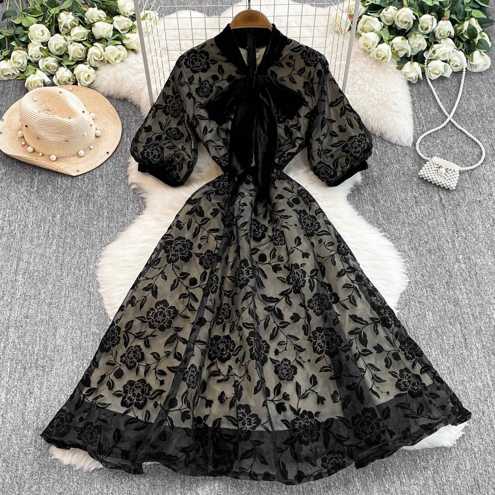 Элегантное французское платье с бантом и рукавами-фонариками, женская коллекция 2025 года, весна-осень, новое тонкое длинное платье с цветочным принтом и талией, одежда для вечеринок в стиле пэчворк L чёрный