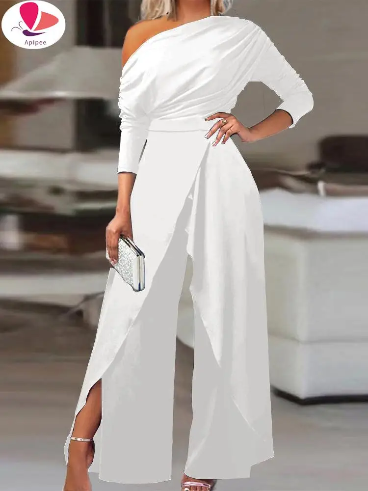 Элегантные Комбинезоны APIPEE, женский весенний комбинезон с рюшами, открытыми плечами, сексуальный комбинезон с разрезом и широкими штанинами, Женский однотонный комбинезон