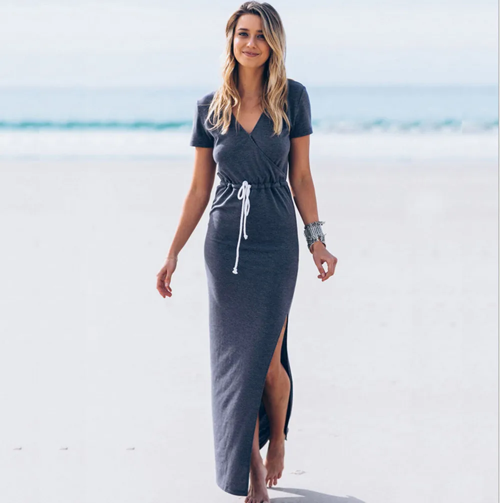 Элегантные женские платья с V-образным вырезом и коротким рукавом, юбка-карандаш с разрезом, однотонное платье, женское хлопковое пляжное пл...