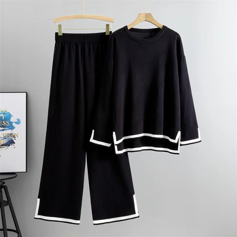 Элегантные женские топы с длинным рукавом, трикотажные комплекты из 2 предметов, повседневные женские свитера, костюмы с разрезом, длинные широкие брюки XL чёрный